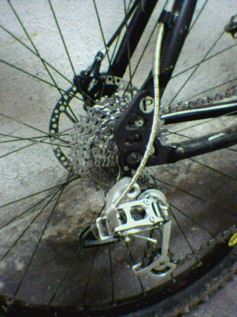 An FSA Afterburner crankset (3x) with Crankbrothers Egg Beater pedals and SRAM’s Gripshift with a top-of-the-shelf X0 9x rear derailleur completed the picture. The only Shimano piece allowed on the bike was the XTR front derailleur. Final touches: a Thomson Elite seatpost and Nokon cable hoses—what else on an early 2000s bike!