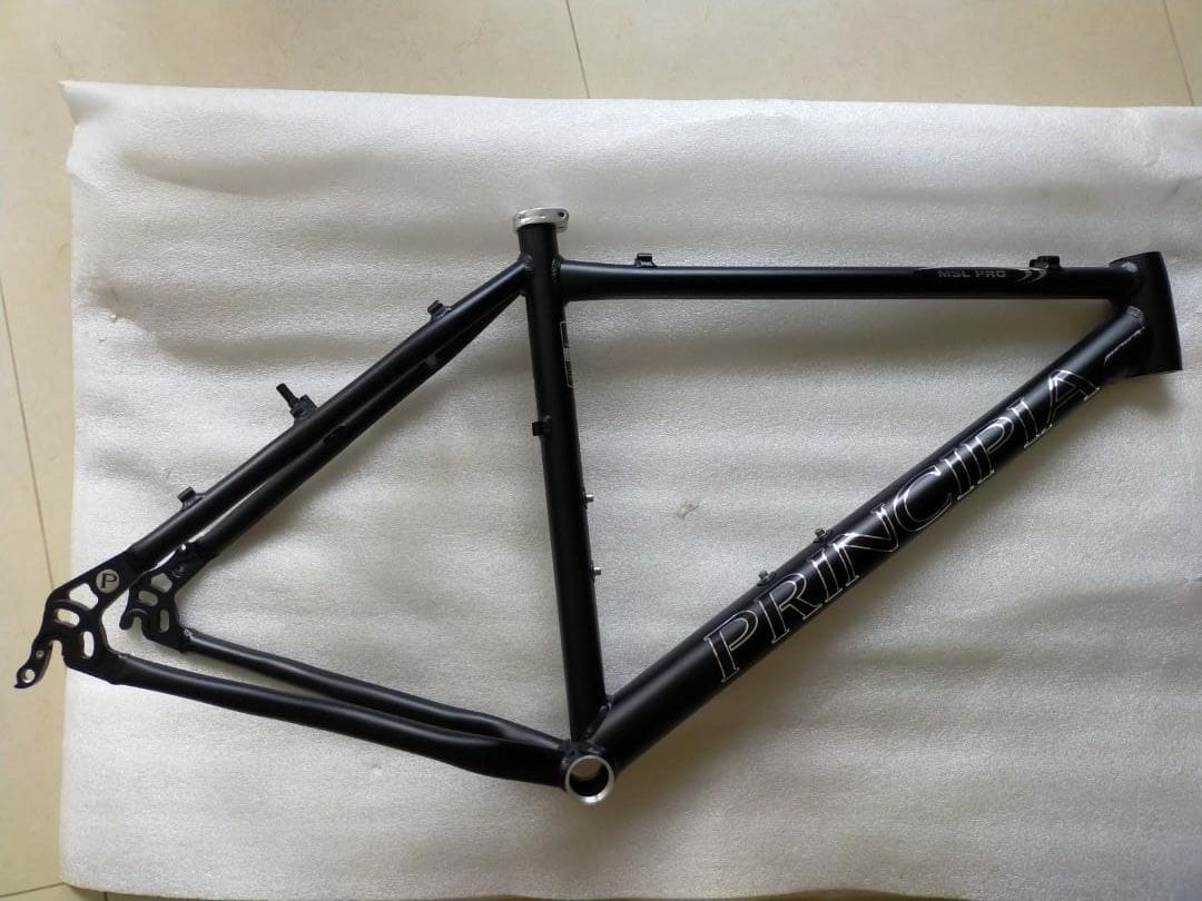 But first, I needed a frame. And obviously, the bike had to be light. The guys at Backyard in Zurich had exactly the part standing around that I needed: a Principia MTB frame. In the early 2000s, Principia was a famous name standing for insanely light road race and triathlon frames. The simple lines and the matte black paint job with the big silver PRINCIPIA name tag down the main tube were simply stunning.